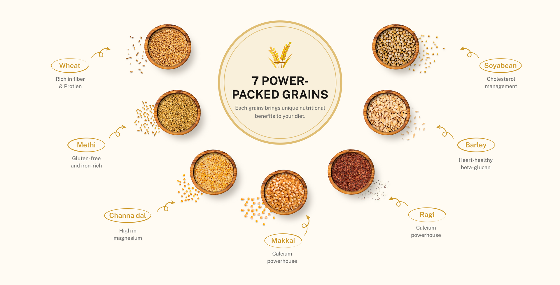 Made from 7 selected grains, our atta is stone-ground to preserve maximum nutrition